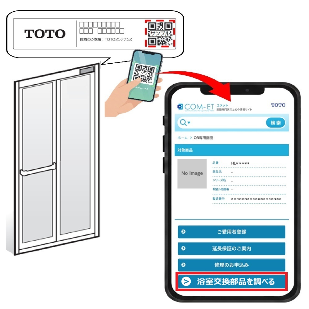 浴室ドア上部の品番ラベルにある二次元コードから、現在ご使用中の消耗部品・補修部品の検索ができ、そのまま当サイトからご購入いただけます。